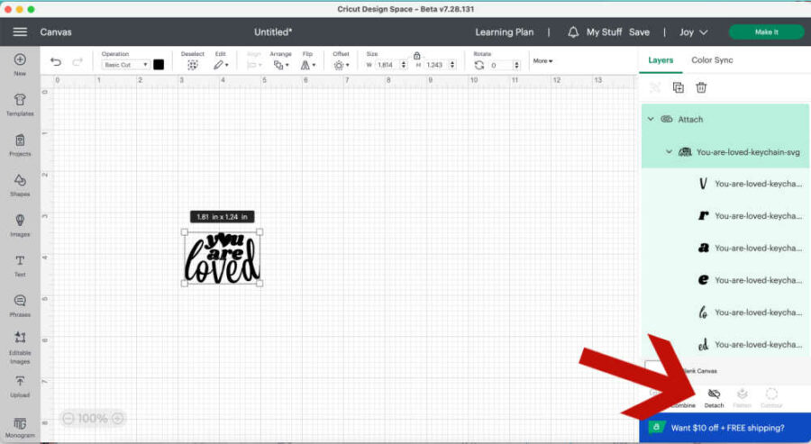 The final step before cutting is to attach it all. Highlight the design and click “Attach” on the bottom right dashboard.