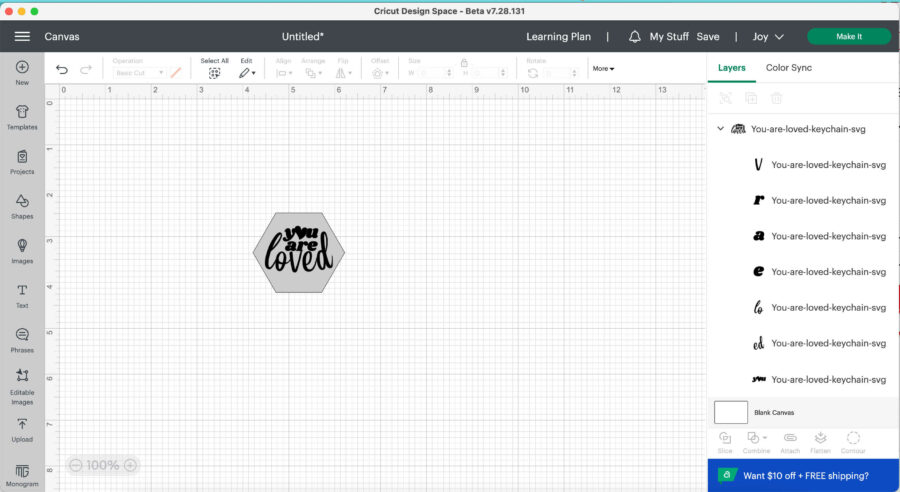 Size the shape to the same as your keychain. Click “Arrange” on the top menu and “Send to Back” so the shape will be behind the design. Change the colors of the circle and the You Are Loved design so you can tell them apart.