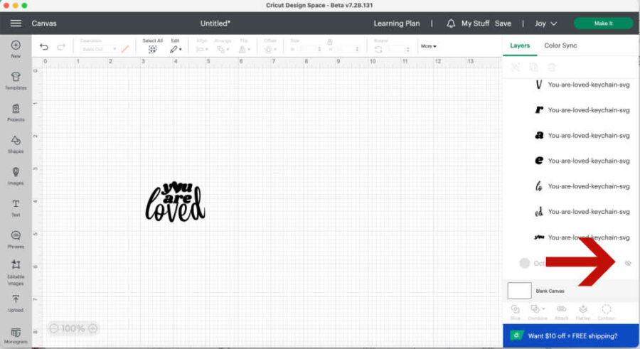 Before cutting, you need to hide the shape. Click the eye next to the Circle layer on the right dashboard. This will hide the shape, and it won’t cut.