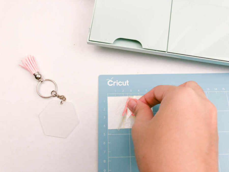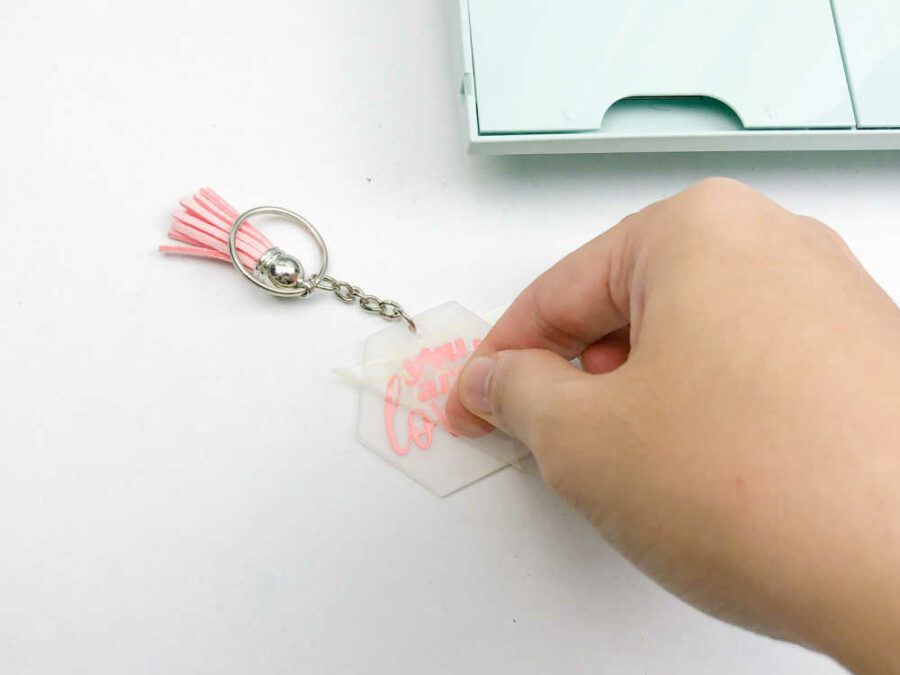 - Once the vinyl is on the clear tape, adhere it to the keychain. Rub the transfer tape again to adhere it well. Carefully pull back the clear tape leaving the vinyl on the keychain.