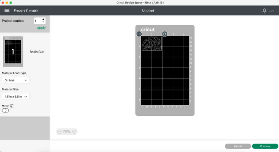 On the next screen, you will see how the Cricut will cut your image on the vinyl. It will tell you how long the SmartVinyl you will need to be. If you use a mat, it will show you where the image will be on the mat. You can move the image around as needed.