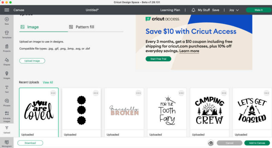We use Design Space on a Mac laptop. The app may be a little different for uploading.