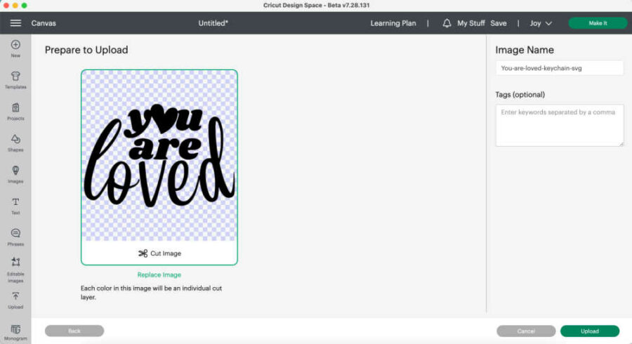 Because this is an SVG file, your only option will be to create a cut file. On the top right, name the file and then press upload on the bottom right. This will add the SVG to your Design Space account.