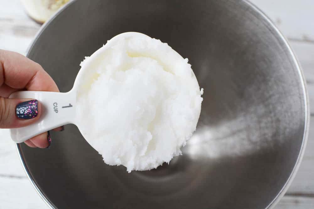 - Add coconut oil to a mixing bowl. Measure the 1 cup while the coconut oil is in a solid-state. If your oil is liquid, put it in the refrigerator to solidify it and then measure it out.