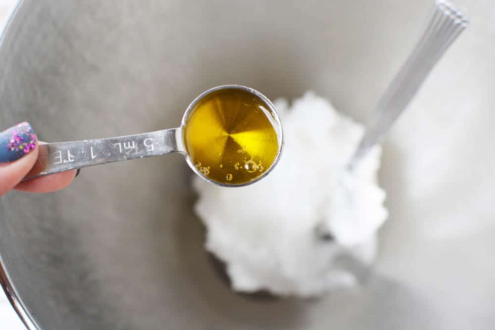- Next, add the almond oil and vitamin E oil to the same mixing bowl.