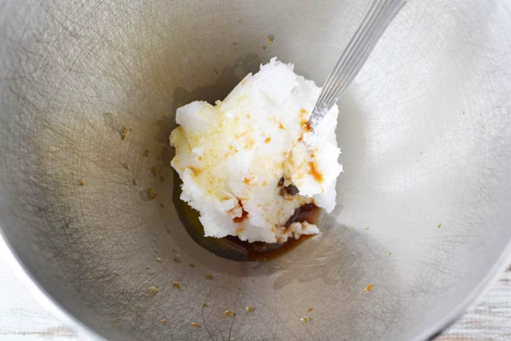 Add coconut oil to a mixing bowl. Measure the 1 cup while the coconut oil is in a solid-state. If your oil is liquid, put it in the refrigerator to solidify it and then measure it out.