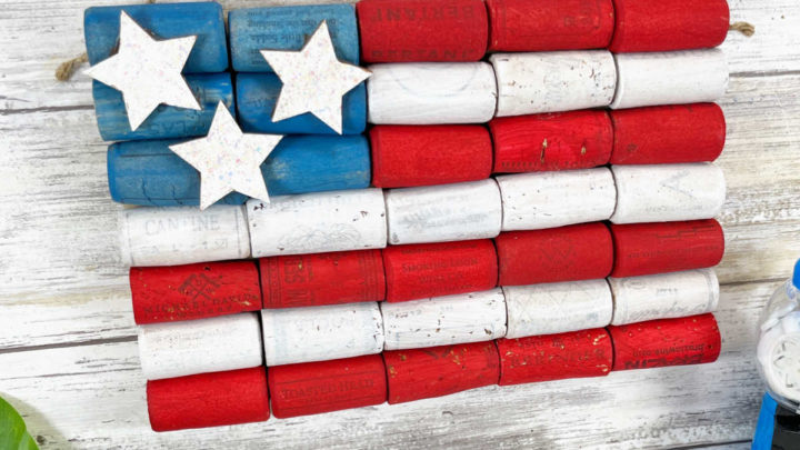 Make an American flag wine cork craft using new or used wine corks, wooden stars, glue, and paint.