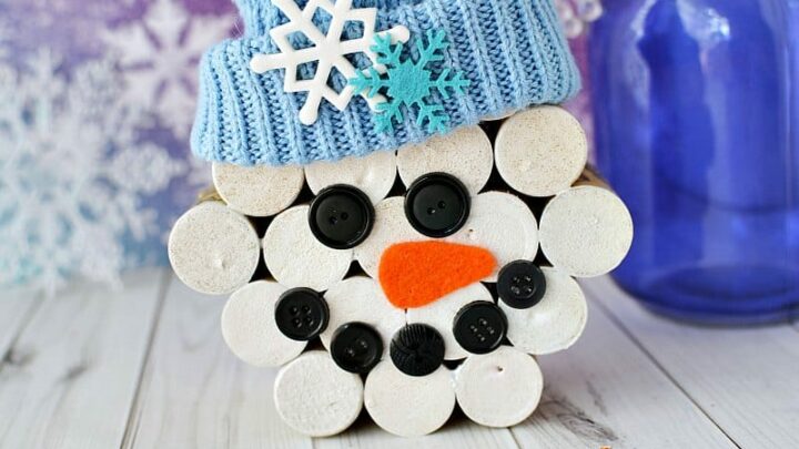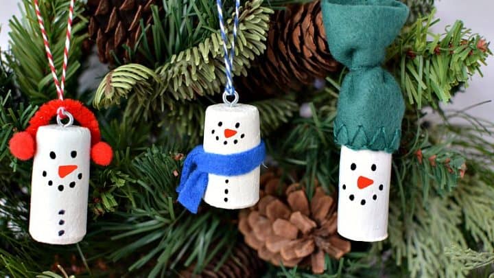 Make snowman Christmas tree ornaments using recycled natural wine corks, paint and fleece! These wine cork Christmas ornaments are easy to make and are perfect gifts.