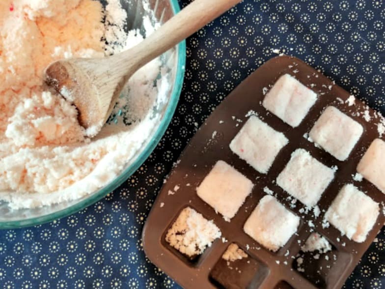 Press firmly into the ice cube tray or mold. A square silicone mold makes popping the finished dishwasher soap tabs out very easily. You may need to tap/bang the ice cube tray to get the finished tabs out. For these types of projects, we always prefer the silicone option.