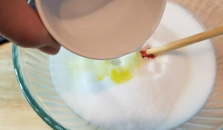 Add white vinegar. This is just plain white vinegar. It will fizz a bit, but that is just the vinegar reacting with the baking soda like those volcano projects you’ve done in school.