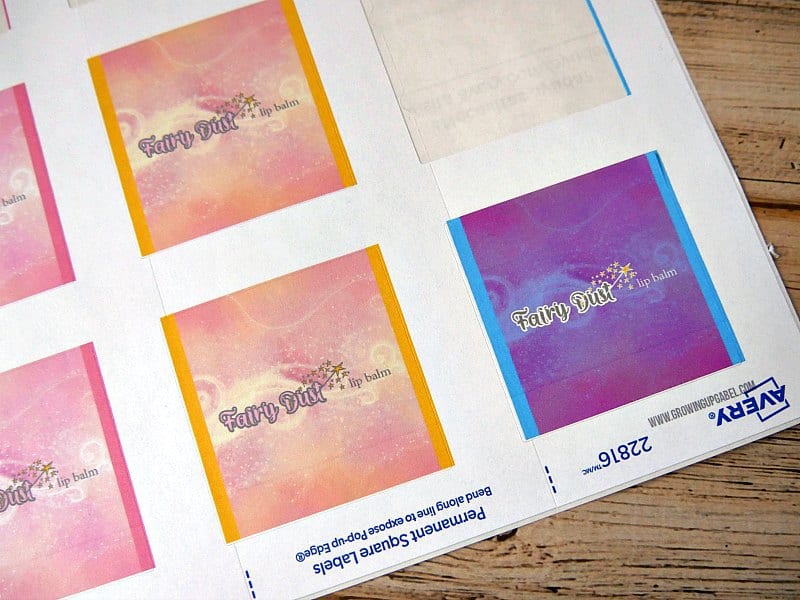 Once the lip balms are cool and solid, add one of our Fairy Dust Lip Balm labels! The labels fit Avery 22816 2 x 2 inch square labels. I love printable labels but they are never, ever consistent. So the labels may print a little askew because not one label is the same as the other. You can also print them on paper and cut them out and tape on.