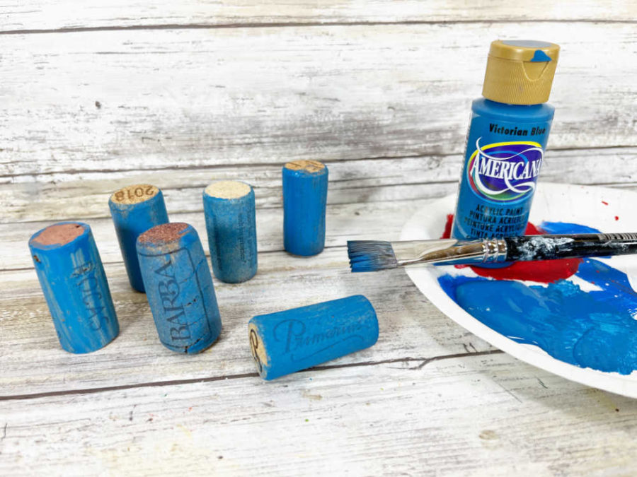 Finally, paint 6 wine corks with the blue acrylic craft paint. Let the wine corks fully dry before moving on to the next step.