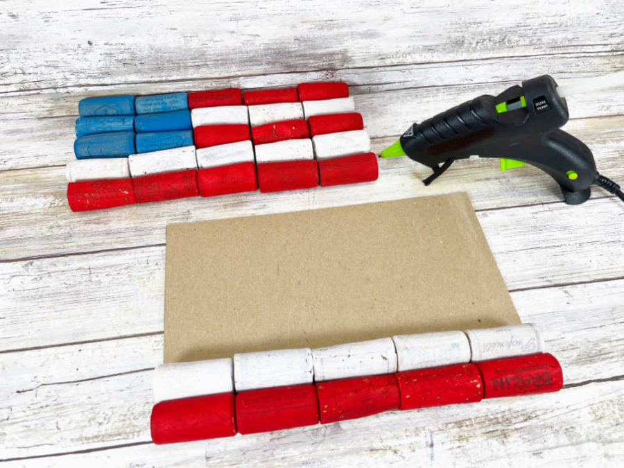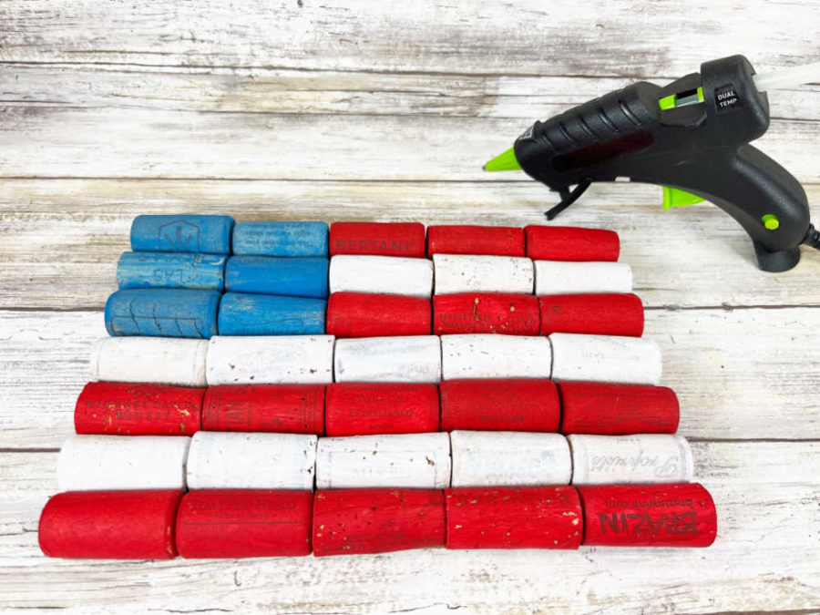 - Starting at the bottom, attach 5 red corks in a row using a glue gun and glue sticks. Add a row of 5 white corks, then alternate red and white until the flag has four red stripes and three white stripes.