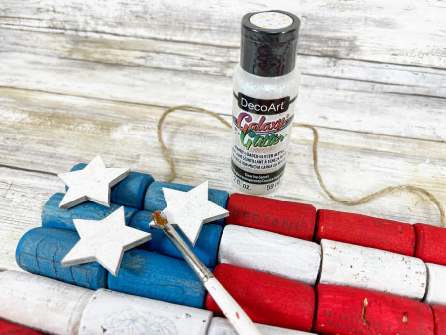 Using a paintbrush in a dabbing motion, add the holographic glitter acrylic craft paint to the three wooden stars to add some sparkle.