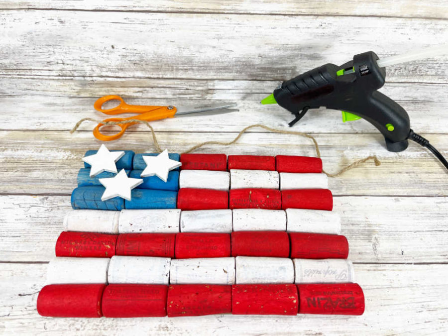 Starting at the bottom, attach 5 red corks in a row using a glue gun and glue sticks. Add a row of 5 white corks, then alternate red and white until the flag has four red stripes and three white stripes.