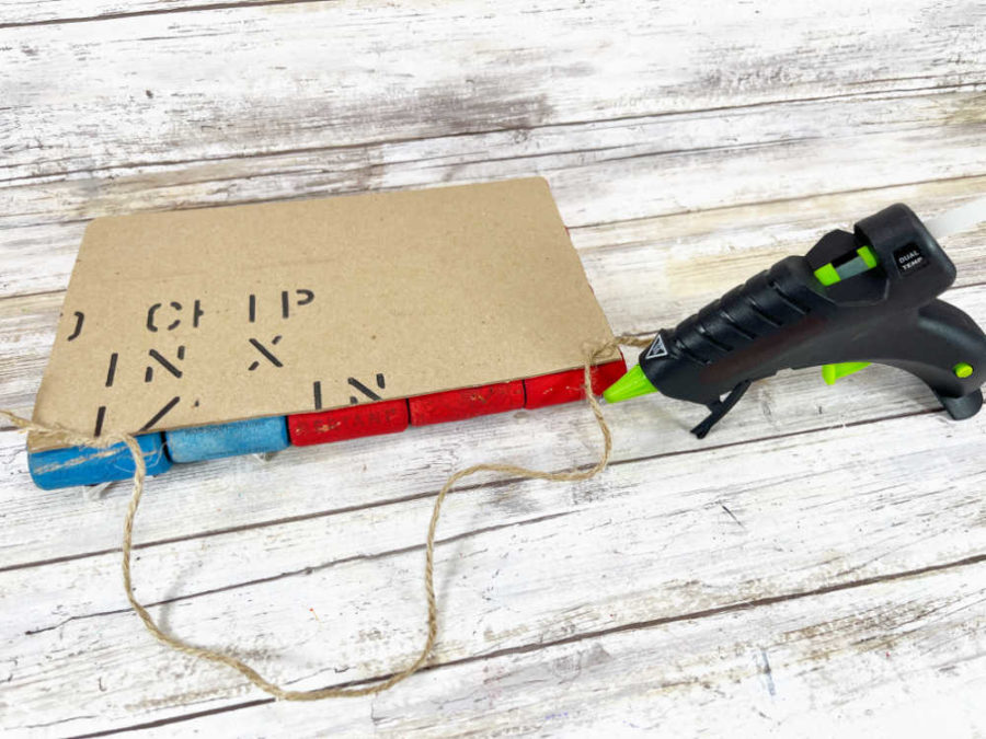 - Flip the flag over and glue the ends of the jute twine to the top right and top left-hand corners with a glue gun and glue sticks.