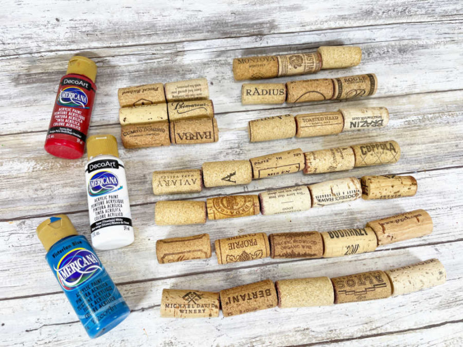 Separate the corks for painting; 16 red, 13 white, and 6 blue. You can use more or fewer wine corks to create the perfect size flag for your home décor.