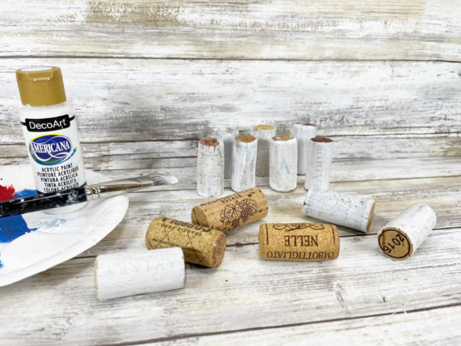 Paint the 13 wine corks with a basecoat of white paint. You can add some water to the paint to create a whitewash look so that the printing on the cork shows through for added interest.
