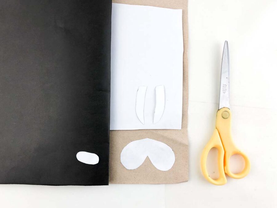 - Trace and then cut out the nose on black paper, the teeth on white paper, and the beard on light brown paper.