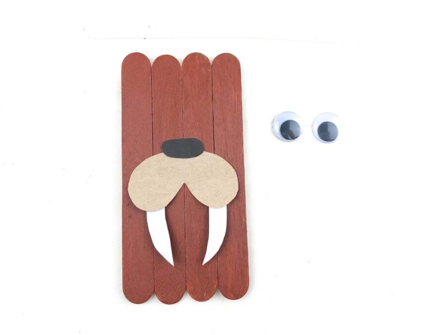 - Glue the nose, beard, teeth, and googly eyes to the body of the walrus.