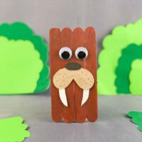 Use popsicle craft sticks to make an adorable walrus popsicle stick craft. Paint the popsicle sticks with craft paint and add details like eyes, nose, teeth, and mouth. This cute little popsicle stick walrus is one of four winter animal popsicle stick crafts we’ve created. The walrus also has an owl, a polar bear, and a fox friend. You can create just one or make the entire set.