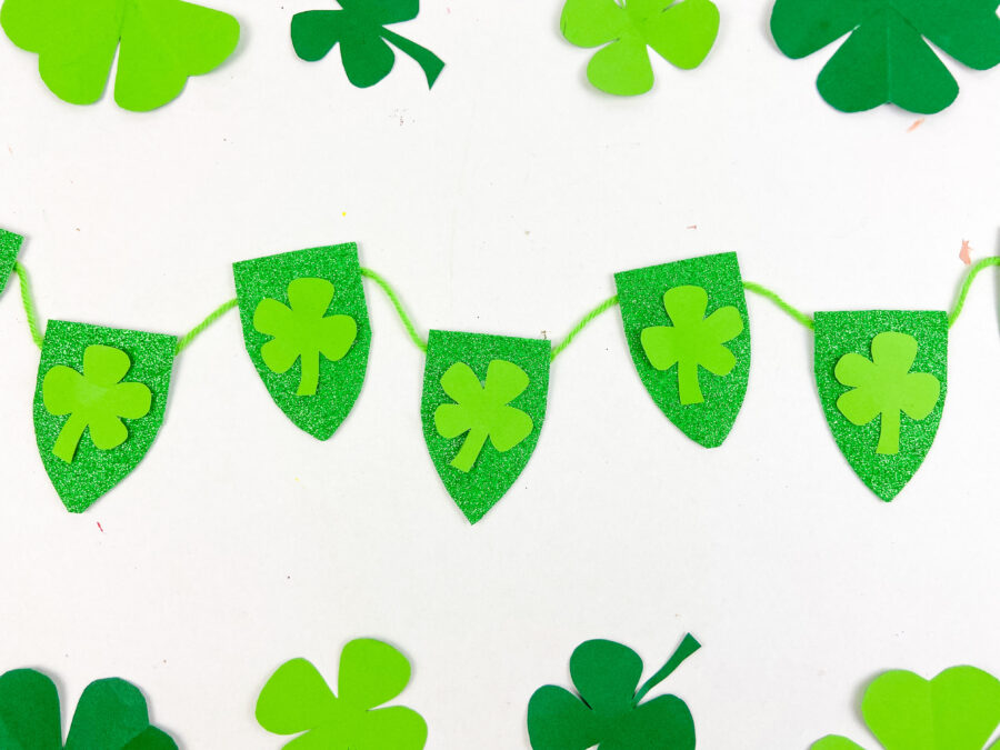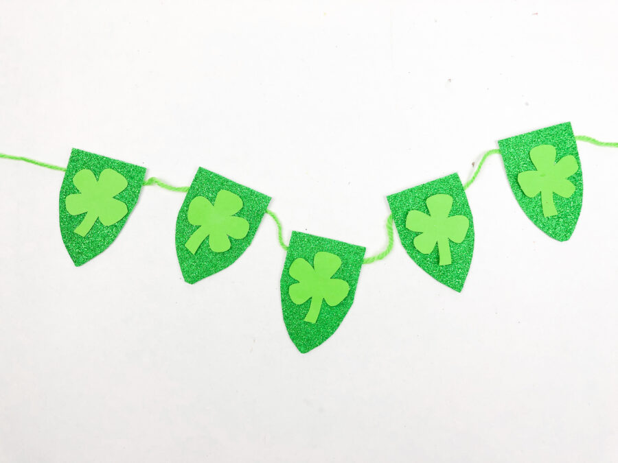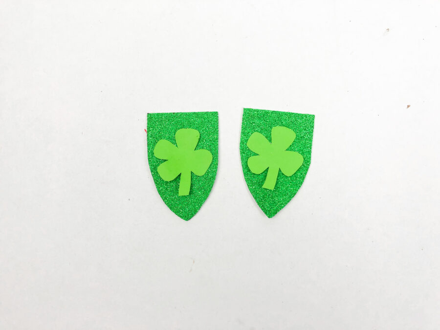 Trace the background “shield” shape onto the glitter cardstock and the clover onto the green construction paper. Create as many as you would like for the length of the garland.