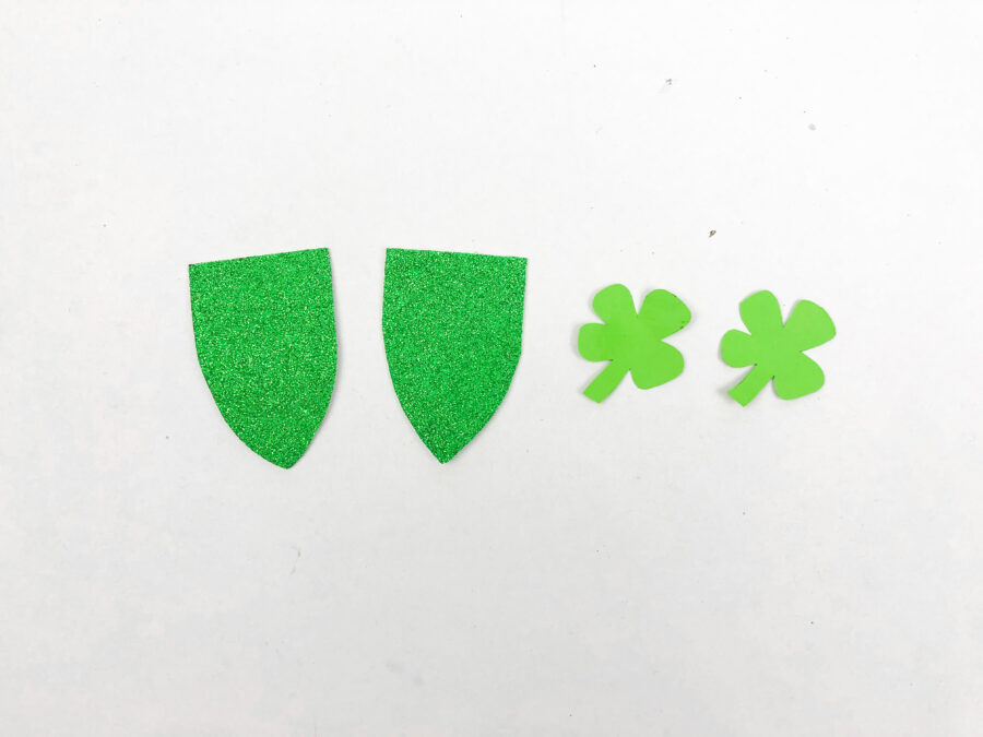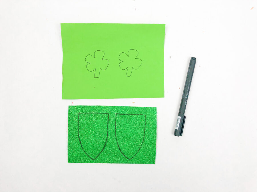 - Trace and cut out the background “shield” shape onto the glitter cardstock and the clover onto the green construction paper. Create as many as you would like for the length of the garland.