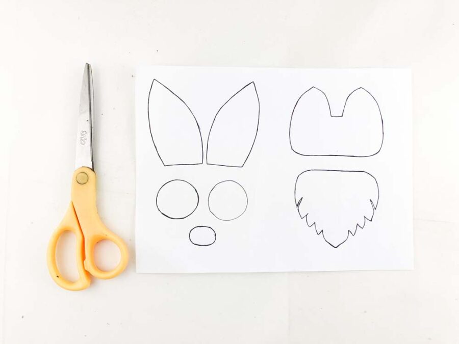 - Download the template. Print and then cut out the template pieces for the fox’s face, chest fur, tail, and ears.