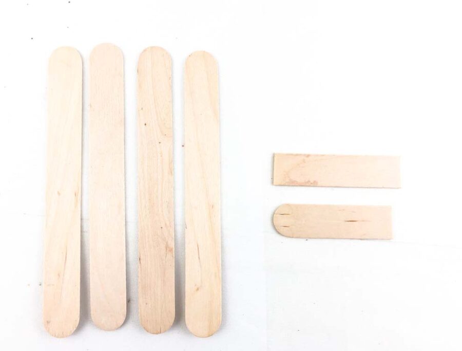 - Use scissors to cut one craft popsicle stick in half. Lay four popsicle sticks side by side on a flat surface.