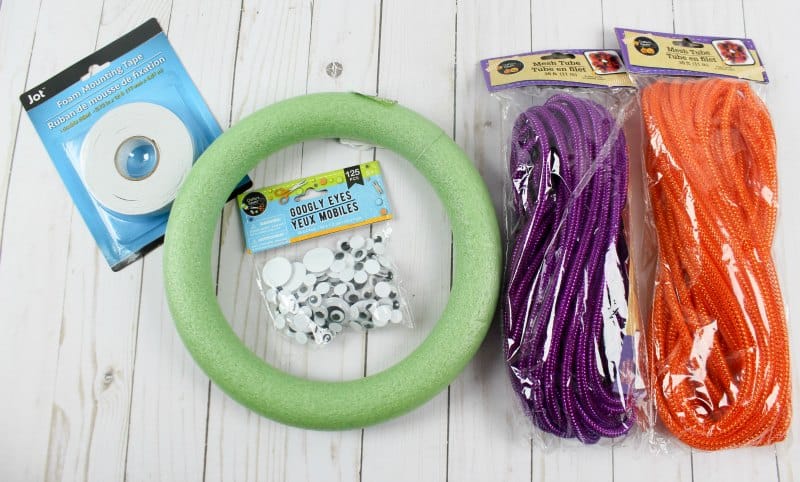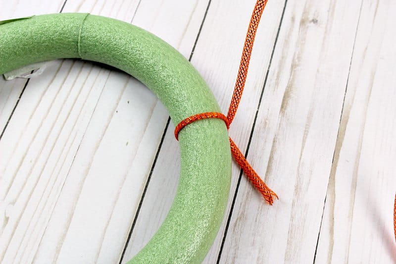 We used a 10″ wreath form for this craft, but you can use a bigger or smaller one. Just make sure to get enough of the mesh tubing if you get a bigger wreath. Wrap the end of the orange mesh tubing on the wreath and tie a knot.