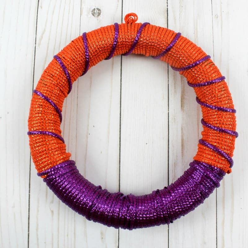 Continue to wrap the tubing around the wreath until it’s completely gone. It will only cover a little more than half. Do the same with the purple mesh tubing at the bottom of the wreath. You will have extra tubing – you can cut it off or wrap it around the orange part a bit like I did.