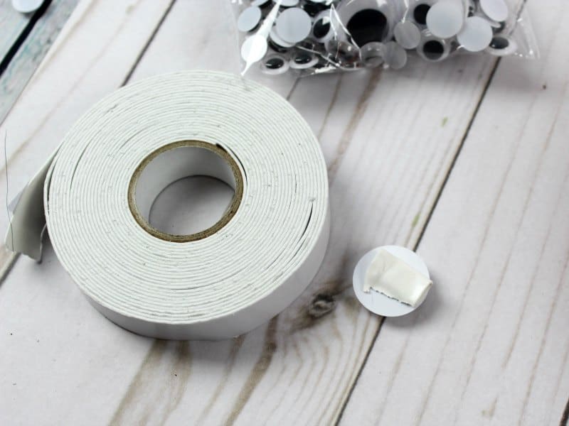 The next step is to attach the googly eyes to the wreath. We used the mounting tape to attach the googly eyes. But you could also use hot glue or Sticky Dots to attach the eyes. Just make sure to use something that attaches the eyes quickly.