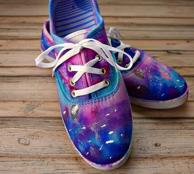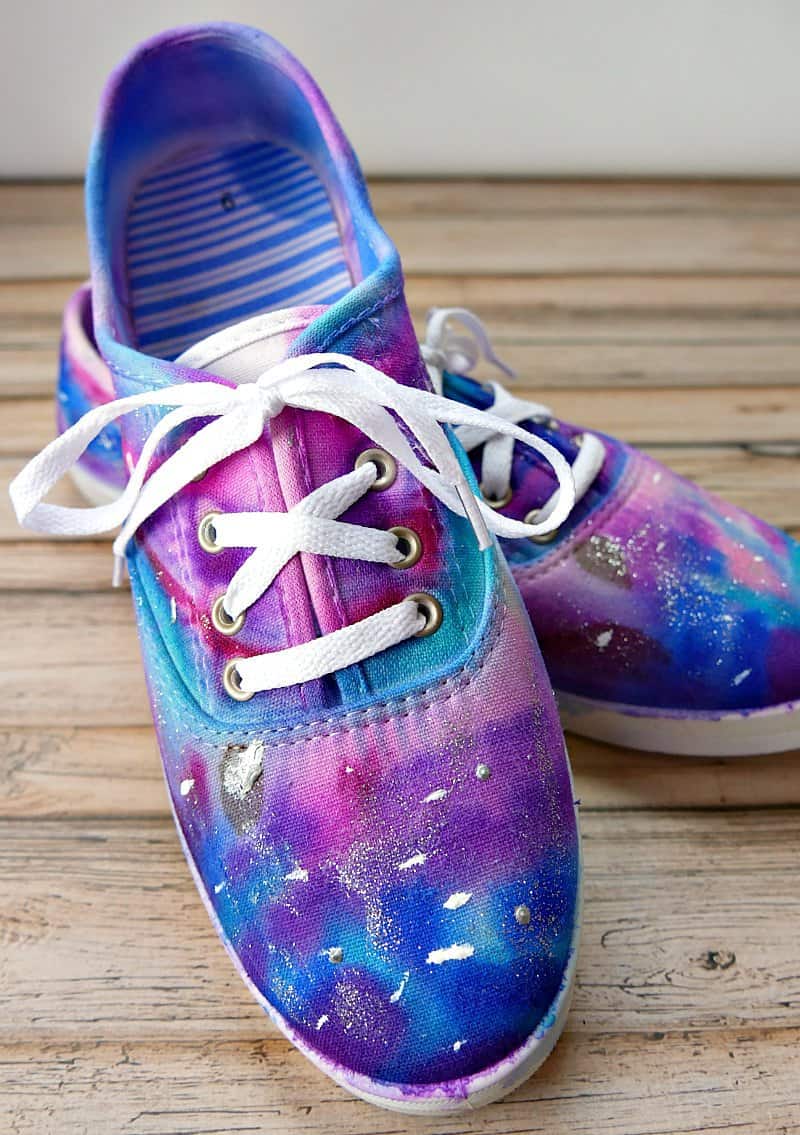 Galaxy shoes are a super fun and easy craft to make with kids. There is very little mess and this is a very inexpensive craft. Plus the kids can wear them! I made these with my 8 and 10 year old and they did most of the work themselves and had a ball doing it.