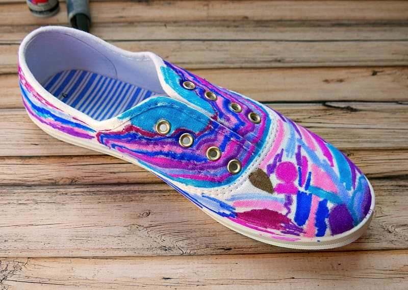 Allow the shoes to dry completely. Once the shoes are dry, add glitter spray or metallic paint to replicate stars. These are my son’s non-galaxy shoes. You can see on the right shoe that he put the marker on in lines. The left shoe was done with large blobs of marker and less color.