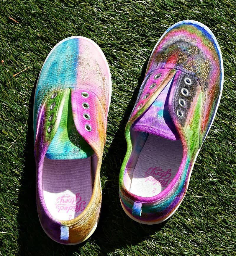 My son ignored the “galaxy” part of the shoes and added a hodgepodge of colors. His colors were much closer to each other, which I wouldn’t recommend. The colors end up running too much into each other. But the shoes still turned out cute.