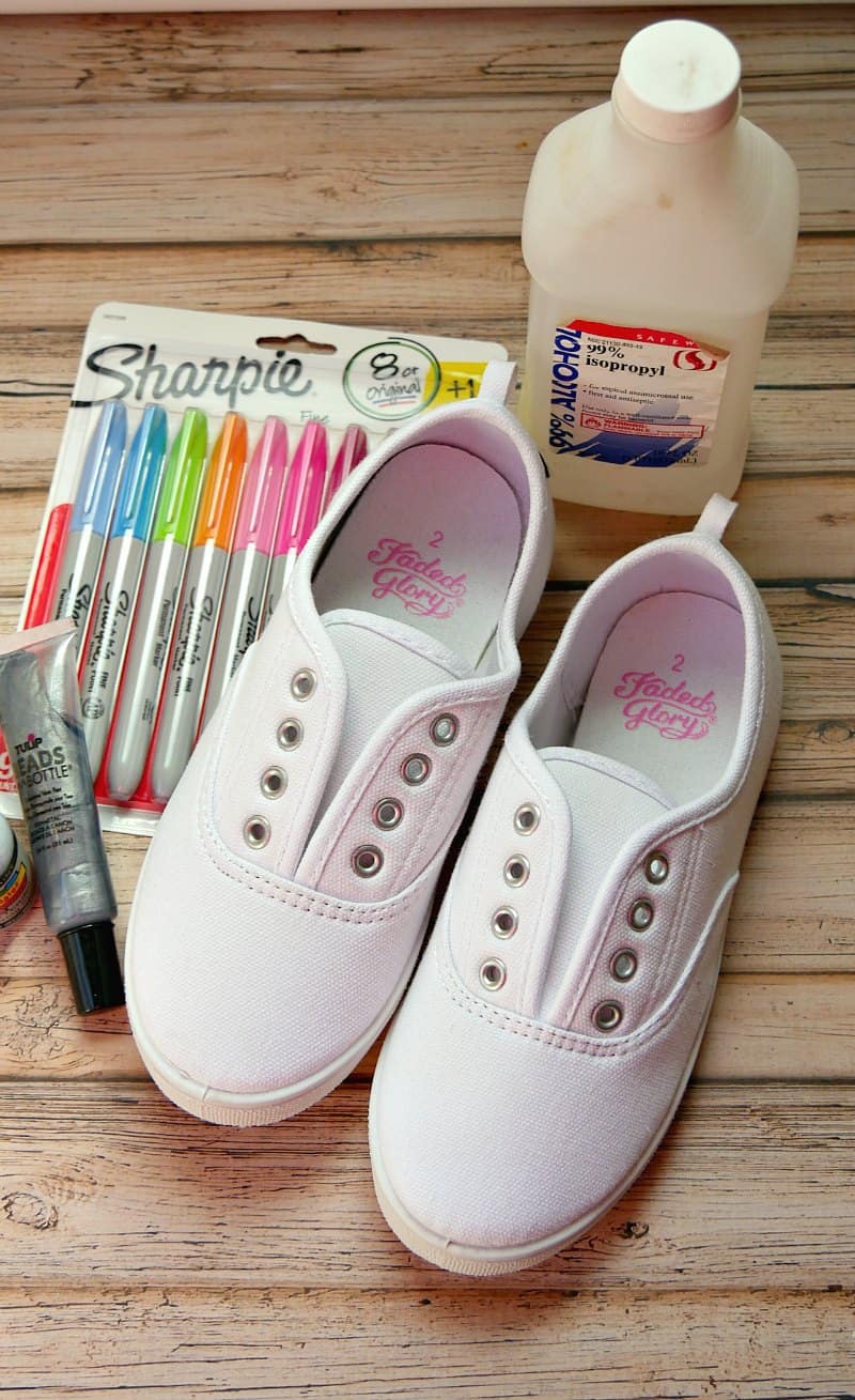 Start by removing the shoelaces from the shoes if they have laces. Let the kids choose the color scheme in the markers they want to use. If you want a genuine “galaxy” look, use blues, purples, and black.