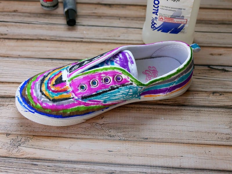 Once the shoes are colored as desired, put the rubbing alcohol into a small spray bottle. Spray the alcohol on the shoes. The marker will begin to spread and bleed. You can add more alcohol to get the colors to run further and darker or less to make them stay put and blur. Turn the shoes as you add the alcohol to get the colors to run where you want them to go.