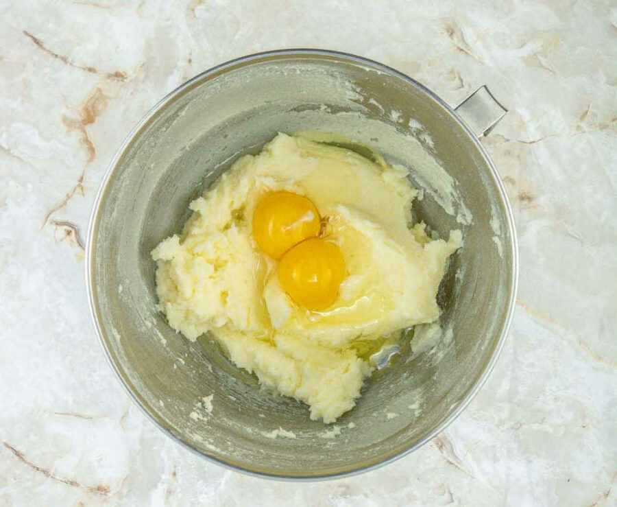 - In the bowl of a stand mixer, combine the sugar and butter. Cream until lighter in color and fluffy.