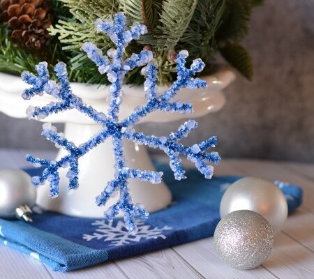 - Glue a small white tinsel pom to the center of each snowflake with a glue gun and glue sticks.