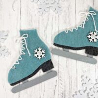 Make ice skates Christmas decorations with felt, jumbo popsicle sticks, and a free ice skate pattern. Trace the free pattern onto the felt to create the boot of the ice skate. The jumbo craft sticks are painted gray for the ice skate blade. The felt skates are embellished with glitter glue, tinsel pompoms, and wood snowflakes. Use the ice skates as Christmas decorations, or keep them up all winter.