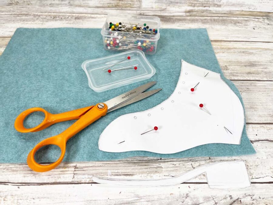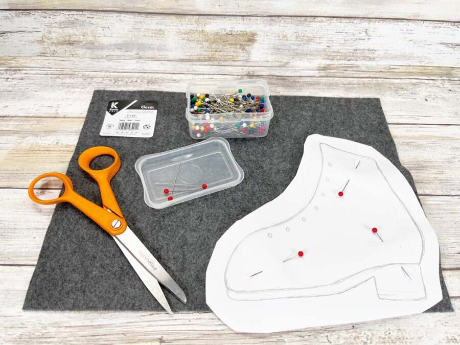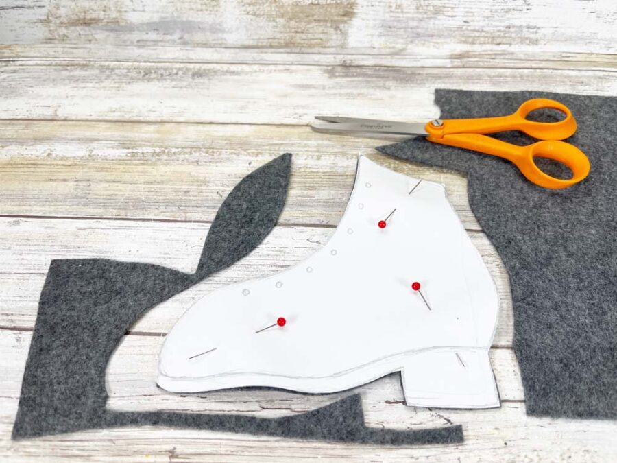 Next, cut out 2 gray ice skates. First, Download, print, and cut out the ICE SKATE PATTERNS. You can get the pattern for free by subscribing to our newsletter. Then using straight pins, secure the pattern to grey craft felt.