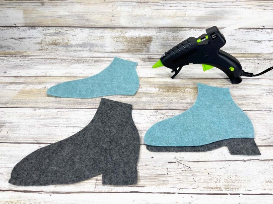 Now, glue the blue felt ice skate boots on top of the grey felt ice skates with a glue gun and glue sticks. You can use liquid craft glue for this project, but it will take longer as you must wait for it to dry.