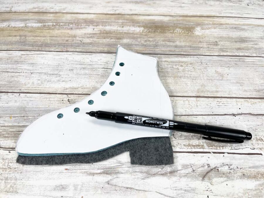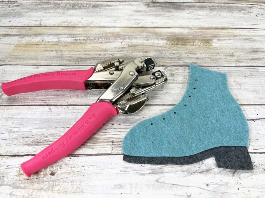 - Use a Crop-A-Dile tool to punch out the lacing holes in the paper pattern. Use a black marker to mark where the holes go on the felt.