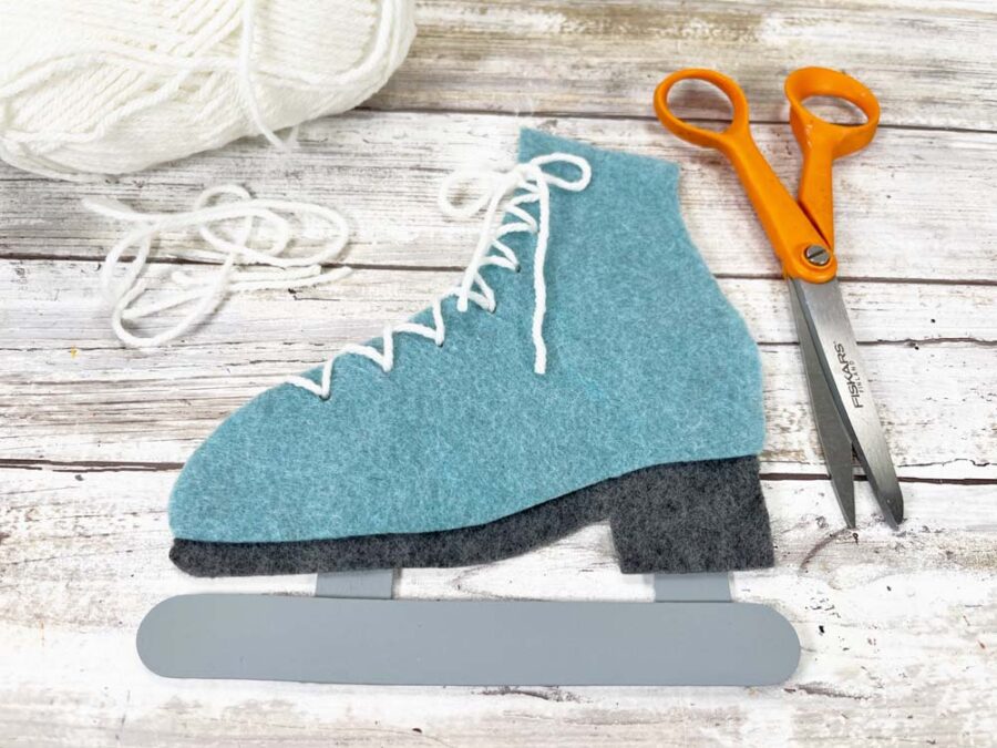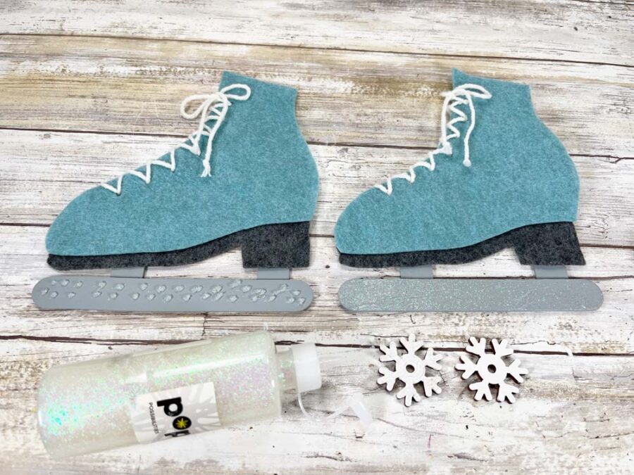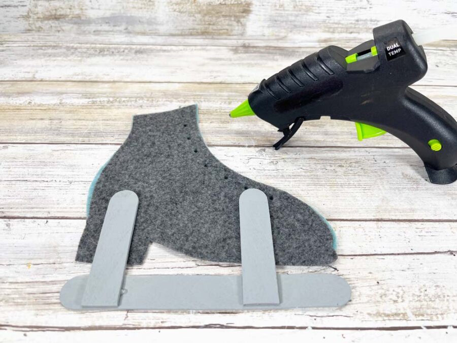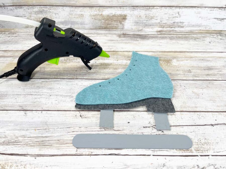 - Glue the blue felt ice skate boots on top of the grey felt ice skates with a glue gun and glue sticks.