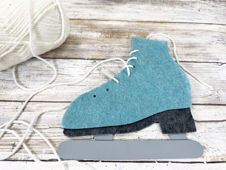 - Starting at the top of the skate, thread the yarn through the holes, wrapping it around the outer edge of the felt skate boot.