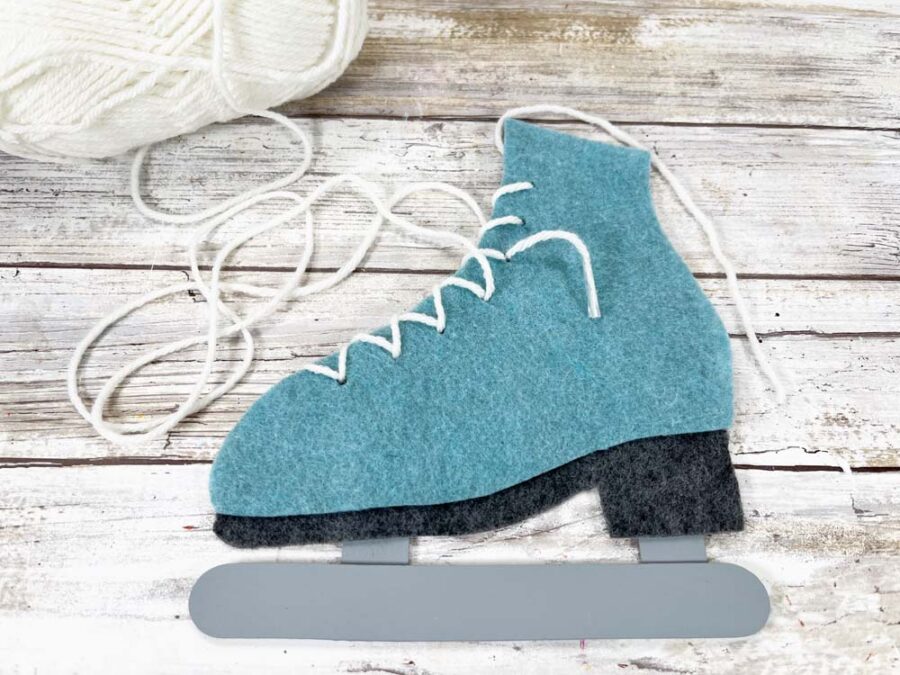 Now it’s time to lace up the ice skates. Measure and cut a 48” length of white yarn for each skate. Wrap the end in clear tape to assist with lacing.