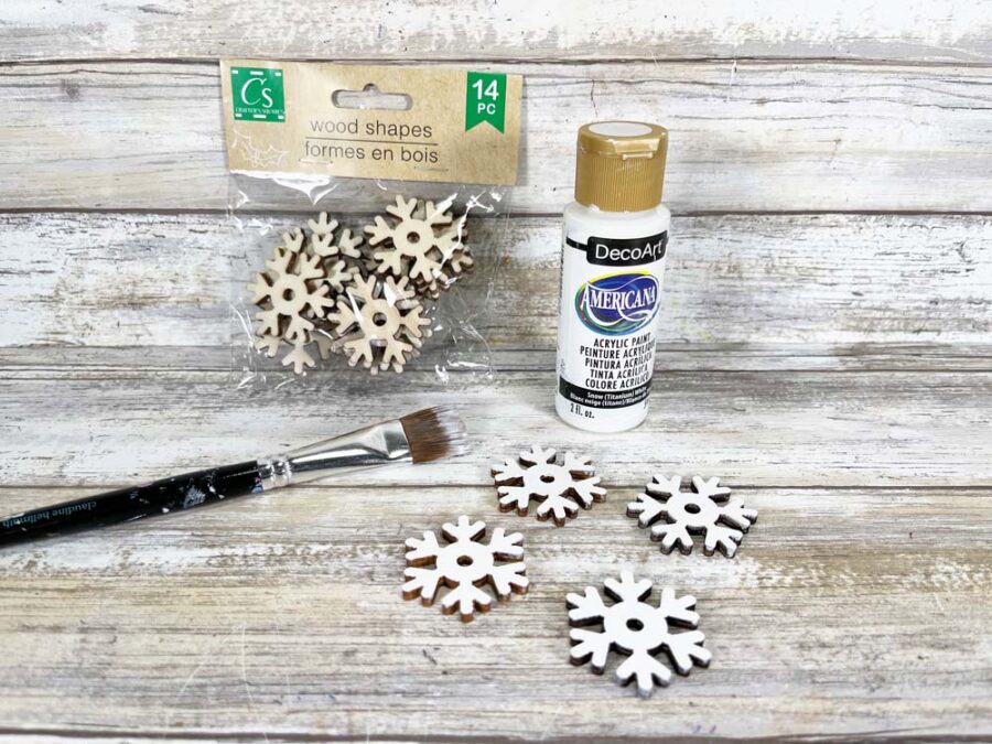 - Paint two wooden snowflakes with white acrylic craft paint. Let dry, and apply a second coat if necessary.
