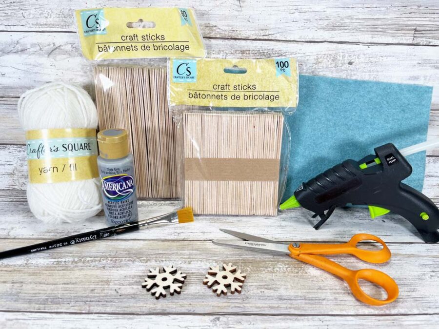 - Cut two jumbo craft sticks in half with scissors. Paint the four half craft sticks and two additional full craft sticks with grey acrylic craft paint. Let dry and apply a second coat, if necessary.