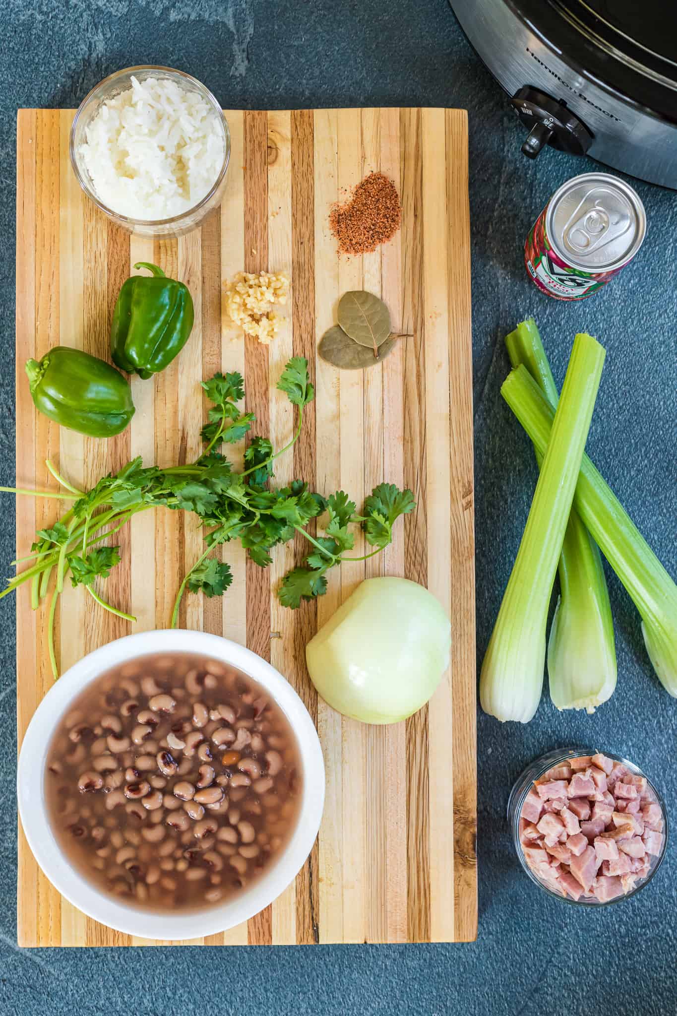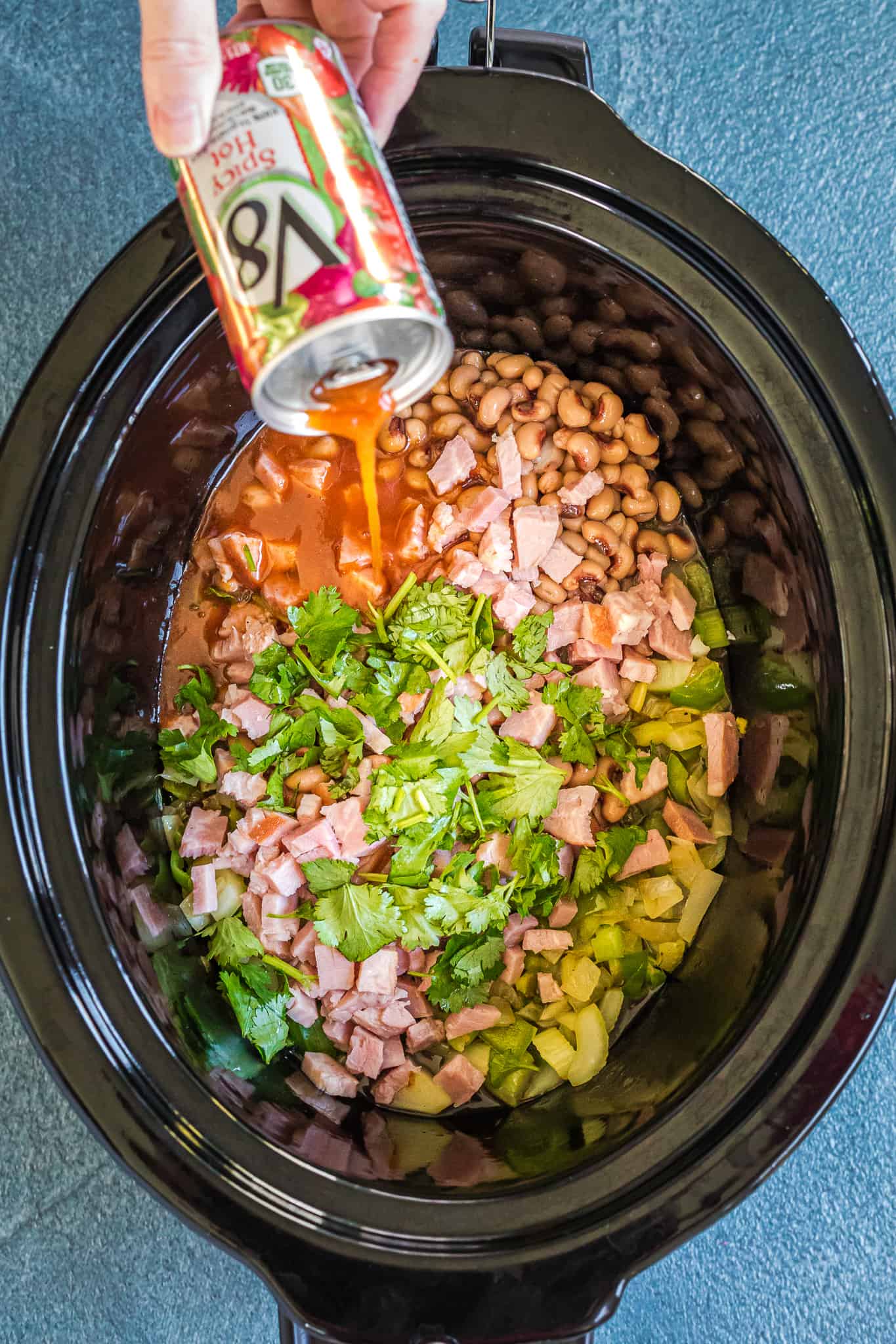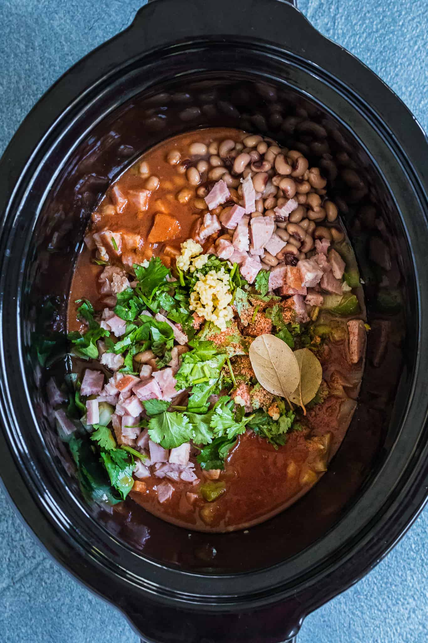 Basically to make this dish, you are going to dump all the ingredients into a slow cooker and then walk away for a few hours. To start, add the black-eyed peas, celery, onion, bell peppers, garlic, ham, cajun seasoning, to the crock of a large slow cooker. Give it a good stir.