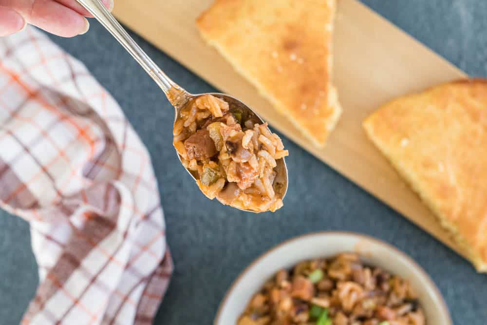 Now, stir in the cooked rice until everything is nice and blended together. That’s it! Your Slow Cooker Black Eyed Peas is ready to serve and bring you good luck in the New Year. Don’t forget to serve the hoppin’ john with a side of Easy Cheesy Bacon Cornbread Recipe. Any leftovers can be refrigerated for up to 4 days and reheated as needed.